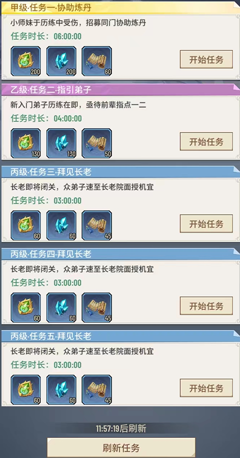 ? 宗门任务:右设任务栏,支持免费刷新,S级任务奖励含橙装碎片+魂玉;