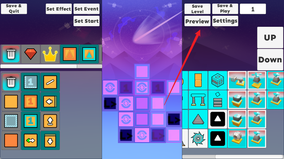 完成布局后,点击界面中央“箭头按钮”,立即进入全真模拟模式——无延迟播放你的关卡,实时观察球体轨迹、碰撞反馈与节奏同步效果;发现不顺之处?随时返回微调,确认满意后点击“保存”,关卡即刻入库;