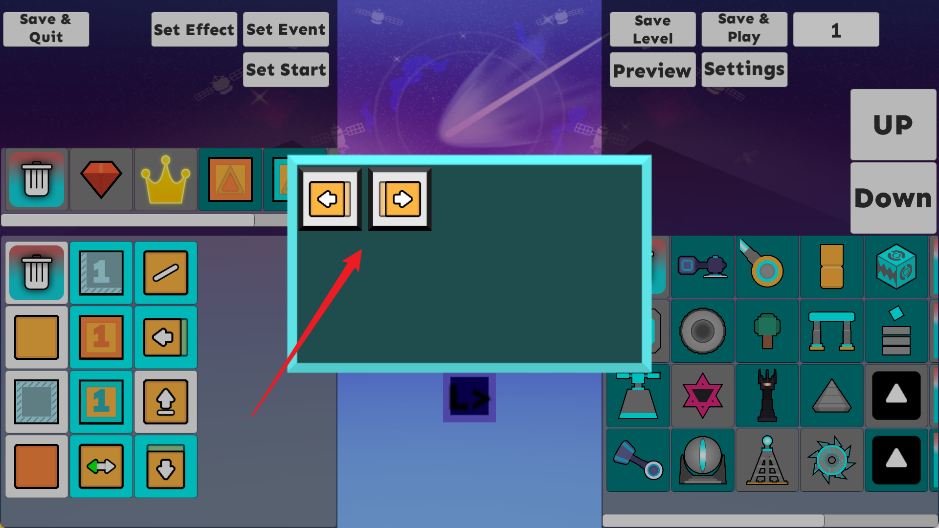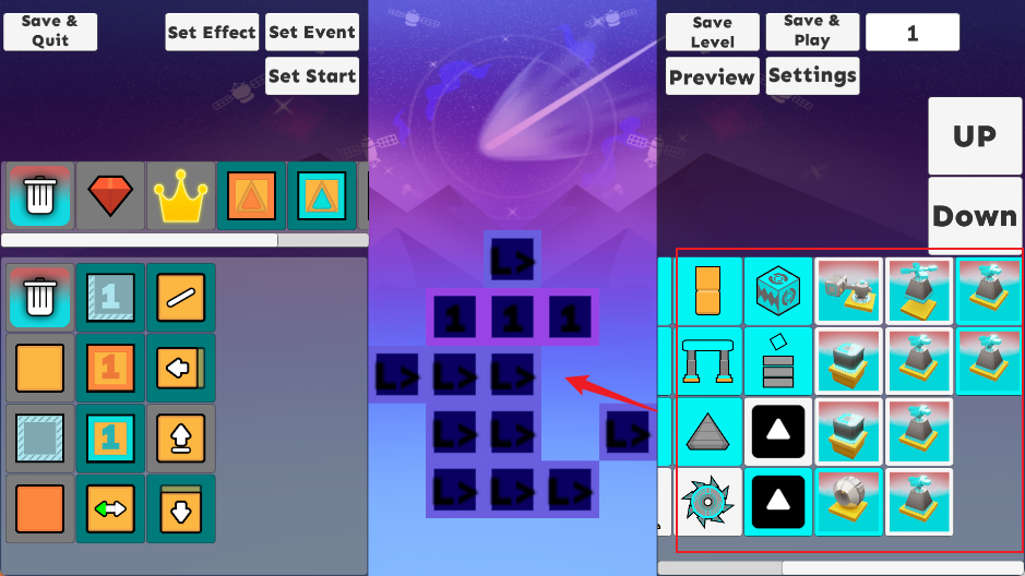 2. 自由搭建轨道:左侧精选地板与奖励元素(加速带、磁吸球、分数加成等),右侧集成全类型机关(尖刺、移动平台、旋转门、节奏触发器……),拖拽即用,所见即所得;
