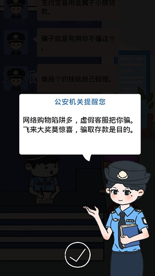 这不是一款普通游戏,而是一堂可交互、可验证、有温度的全民反诈必修课。它把高发诈骗类型(刷单、冒充公检法、虚假投资、情感杀猪盘等)转化为紧凑剧情,每一次点击选择都对应现实中的风险节点;每一段结局揭示,都配有警方真人出镜的精准解析。玩得越深,防得越准。