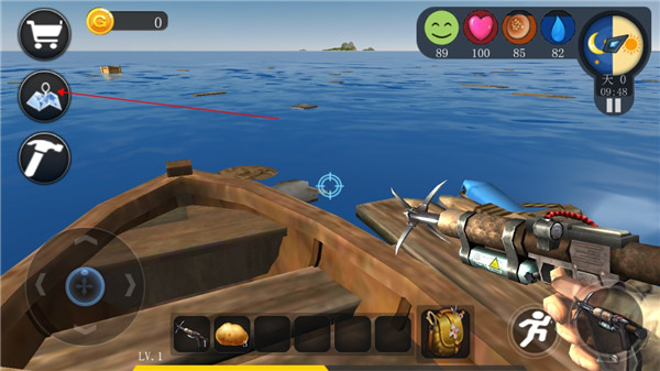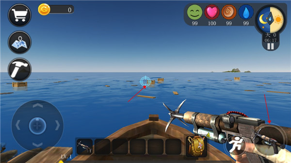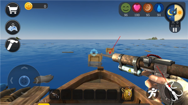 1、点击【新游戏】即刻启航,你将独自立于摇曳小船之上。右手长按屏幕右下角标枪图标,瞄准漂浮的木箱或浮木,精准发射完成首次物资捕获。