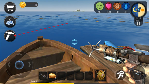 3、生存不止于收集——点击左侧【锤子】图标进入制作系统,将零散材料转化为生存利器:从基础绳索到高级鱼叉,每一件工具都决定着你能走多远。
