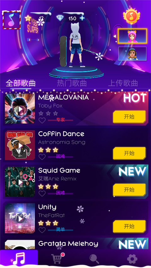 进入游戏后,一键开启挑战;主界面提供三大曲库入口:“全部歌曲”纵览全曲库、“热门歌曲”直通全球热榜、“上传歌曲”秒变个人专属关卡——无论你是榜单追随者,还是小众音乐鉴赏家,都能找到心跳同频的那一首。