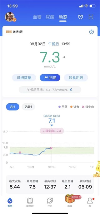 指尖+动态双轨比对:当您进行指尖血糖检测后,App自动同步显示两组数据在同一坐标系中,直观识别偏差区间,辅助判断是否需调整胰岛素用量或饮食计划。