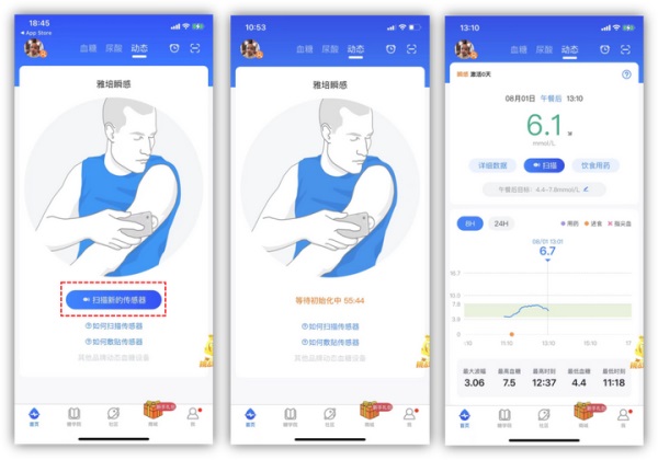 快速扫描,即扫即得:无论新传感器激活还是日常监测,点击“扫描新的传感器”按钮,手机贴近即可秒级读取最新血糖值与趋势方向。
