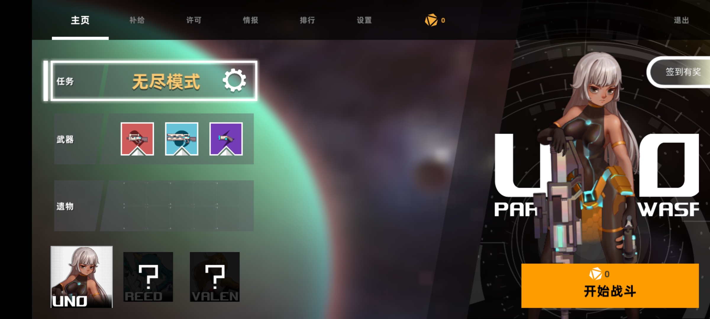1. 点击主界面【Start】进入游戏 → 2. 选择【开始战斗】开启首战 → 3. 熟悉双摇杆操作(移动/射击分离,零学习成本)→ 4. 留意遗物栏:被动提升常驻能力,主动触发爆发技能 → 5. 关注武器状态图标:点击切换武器,紧盯过热条避免断档 → 6. 左上角实时数据流,助你掌控战局节奏。