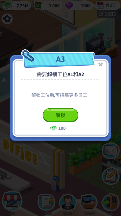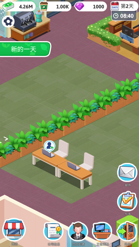 1、打开游戏,即刻进入你的第一间办公室——简洁界面+动态办公场景,直观呈现公司初始状态
