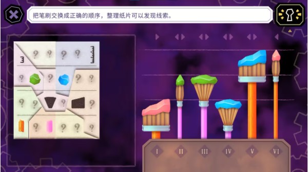 ? 画笔谜题:完成左侧拼图后,按自上而下的视觉逻辑提取四维信息:画笔高度→颜料色相→笔头形状→笔杆色调,构成完整解锁序列。
