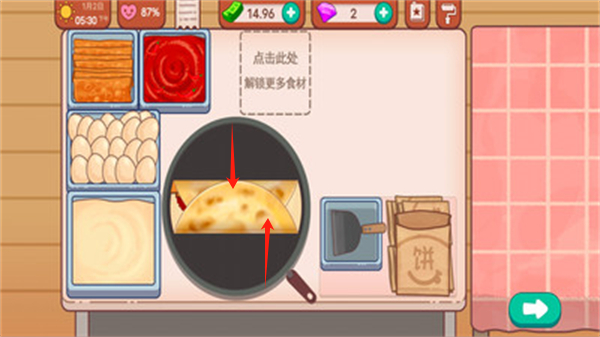游戏以“真实操作感”为核心设计逻辑:从试做煎饼赢得摊位继承权开始,所有食物均需玩家亲手完成关键步骤——面团铺平、馅料搭配、定型翻折、装袋交付,全程点击+滑动交互,拒绝纯挂机。操作反馈灵敏,节奏张弛有度,既满足成就感,又不制造操作焦虑。