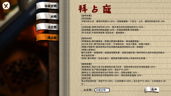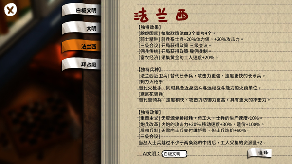 每个文明不仅是皮肤差异,更是底层机制与成长逻辑的深度定制——白板文明适配新手试炼,大明侧重防御协同与火器演进,法兰西强调骑兵突袭与城堡压制,拜占庭则擅长宗教影响与双线资源调度。选择即风格,开局定节奏。