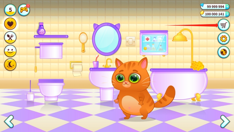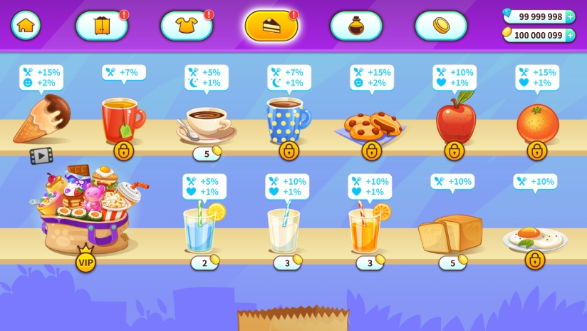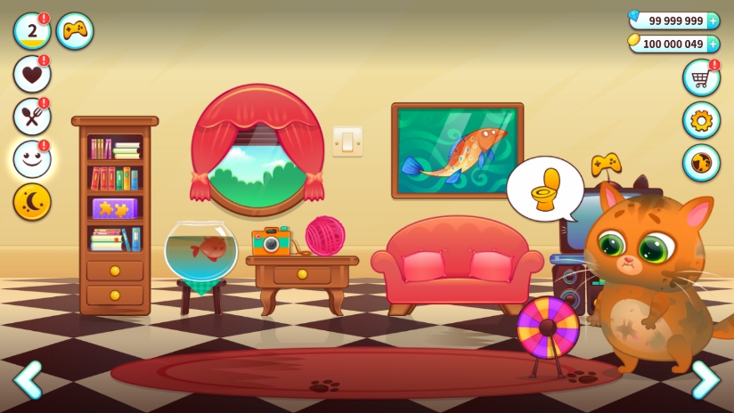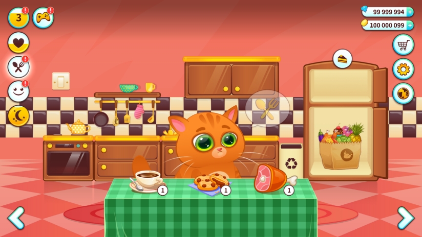 打开冰箱,点击蛋糕图标选购食材——新鲜鱼肉、香甜小饼干、营养猫粮任你挑选;