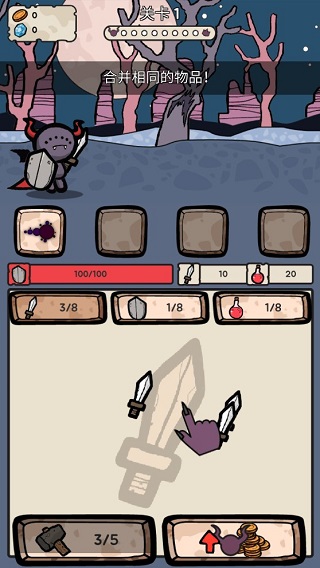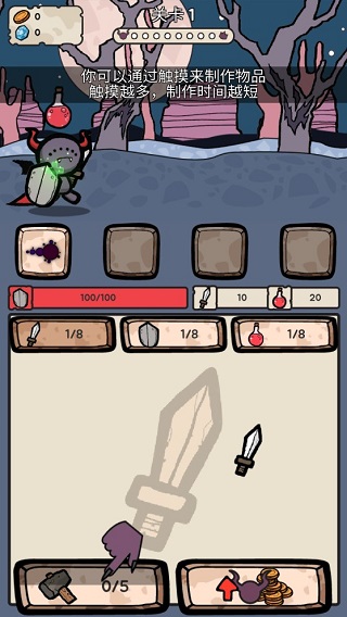 游戏采用极简操作逻辑:长按/点击即可快速制作武器、盾牌与药剂;触摸频率越高,制作速度越快。所有物品支持自动合并——两把短剑合成阔剑,三面铁盾升阶圣盾,重复物品堆叠即触发跃迁式升级。新装备获取后自动穿戴,属性实时生效,真正实现“合成即强化,上线即变强”。