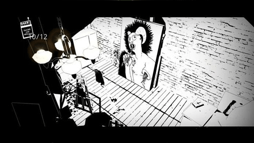 step7:返回画室,开启门口旁开关点亮画板区域灯光。此时鬼魂将徘徊门边,需快速行动——推开通往窗子的巨大画像,从右侧门离开。