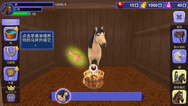 4、通过左侧任务栏触发马匹照护——更换干草、刷毛、喂食、检查健康值;