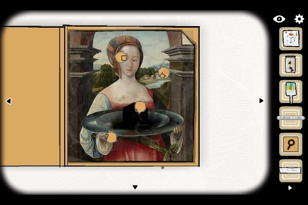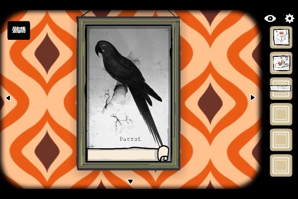 16、依据纸条提示,用雪茄依次灼烧画像指定位置:黑方块上方 → 左手 → 屋顶 → 左眼(此序列将在后续锁具中复用)。