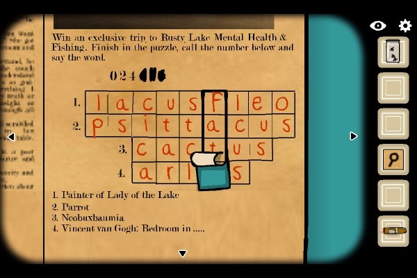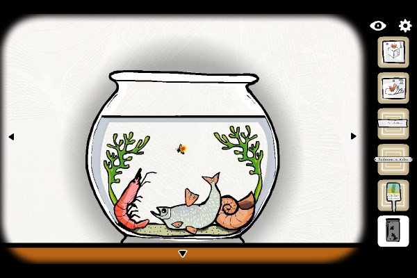 8、将虫罐中小虫投入鱼缸;点击左侧水草诱使虫爬入贝壳;待贝壳内伸出手指点亮虫体后,将其戳出;将发光虫喂食给鱼,鱼吞食后化为第二把钥匙。