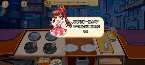 2、首笔启动资金靠“炒米粉”赚取——点击原料区【米粉】,自动完成翻炒,高效又顺手;