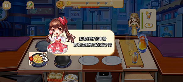 3、炒制完成后,点击出锅图标,将米粉盛入基础餐盒,控制成本稳扎稳打;
