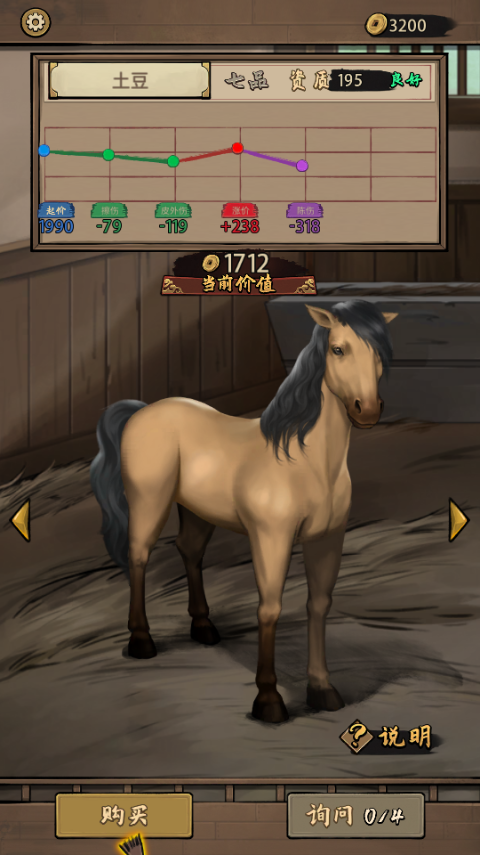 成功议价至1712金币后,果断点击【购买】,将这匹潜力股收入麾下。