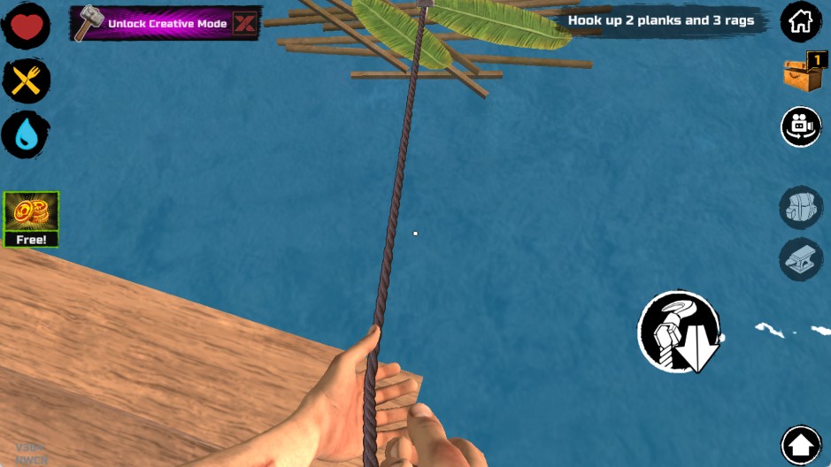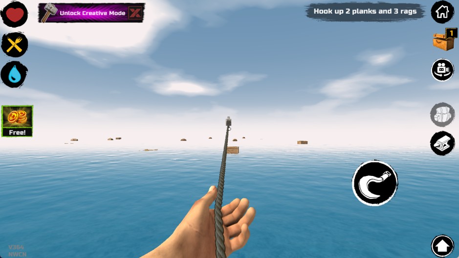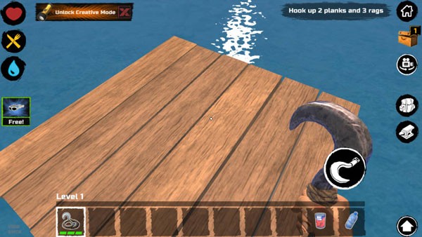 钩子操作小贴士:别死磕单个目标!熟悉钩索飞行弧线后,可连续勾取多物;稍作停顿再收钩,既能节省耐久,又能提升满载率。记住——所有重要物品请远离木筏边缘摆放(渔网除外),否则鲨鱼咬毁木板时,连同上面的设备一并“清空”!