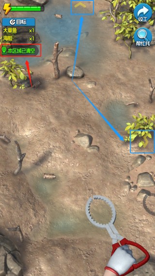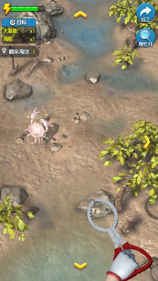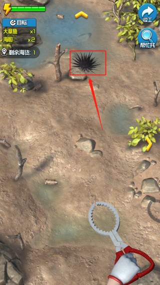 游戏以“退潮赶海”为核心节奏,每局任务清晰明确:在限定时间内,深入不同滩涂区域,识别并捕获指定海货。操作简单却富有策略性——点击即可采集普通海胆、蛤蜊等;遭遇高价值目标(如狗鲨、大章鱼)则触发QTE微操作:精准把握绿色发力区间,一击制胜!区域清空后通过箭头切换新地图,持续拓展你的赶海版图。