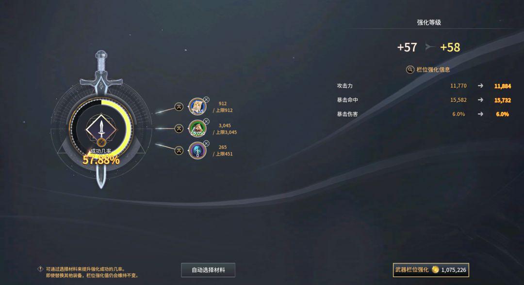 装备强化黄金法则:武器追求极限强化率(金币投入优先级最高);防具因材料稀缺,务必锁定100%成功率;饰品则可接受40%~60%概率强化,兼顾效率与成本。