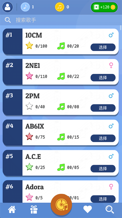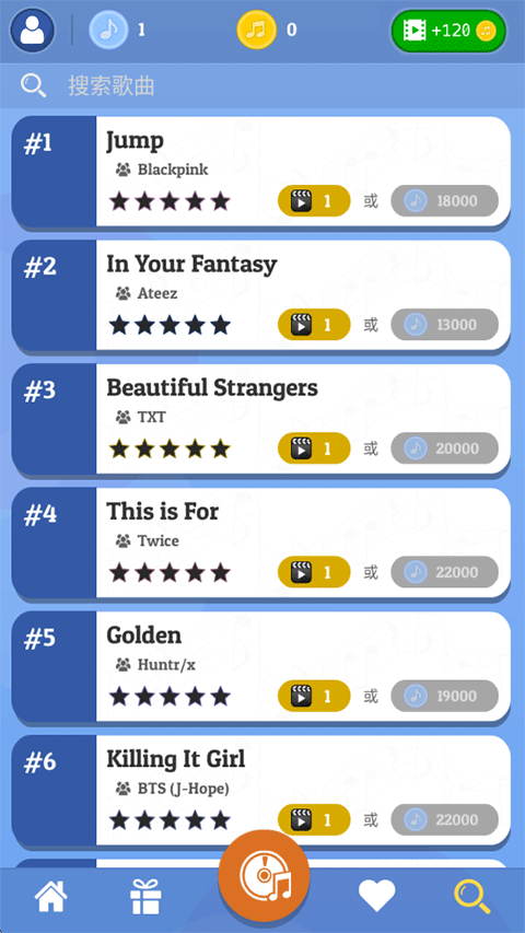 3、右上角搜索图标支持关键词直达,热门曲目需用游戏内音币解锁演奏权限;