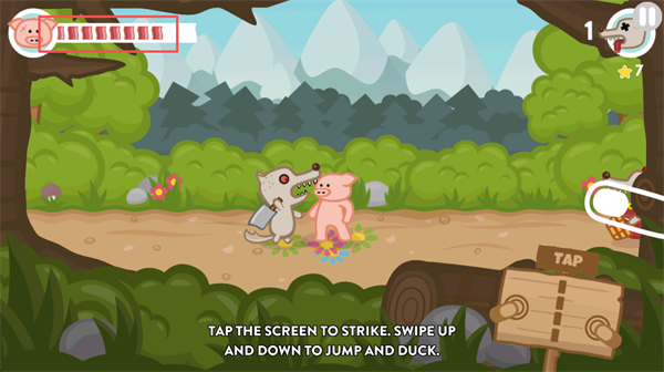 左上角那几片晃动的培根,就是你的全部生命!每次被击中掉落一条,绷紧神经盯住它——保命比炫技更重要。