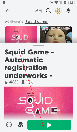 Squid game:搜索结果中,优先选择点赞率约48%、实时在线人数约1.1万人的房间;