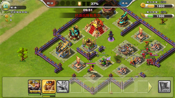 战斗全程可见敌方城墙耐久、守军状态与技能冷却;及时释放武将怒气技打断敌方攻城器械,利用【骑兵冲阵】【火攻陷阱】等战术组合瓦解防线,以最小损耗夺取最大收益。