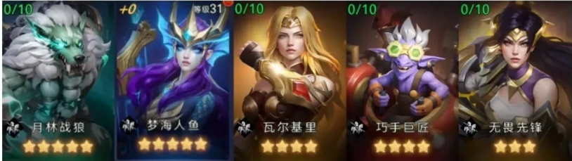3、前期低投入阵容:月林战狼、梦海人鱼、瓦尔基里、巧手巨匠、无畏先锋