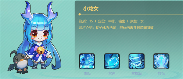 萌系元素法师,队伍“化学反应”发起者。「龙怒」与「水螺旋」附带潮湿状态,与火系武将联动触发爆炸伤害,是组建元素流、速攻流、爆发流的核心枢纽。