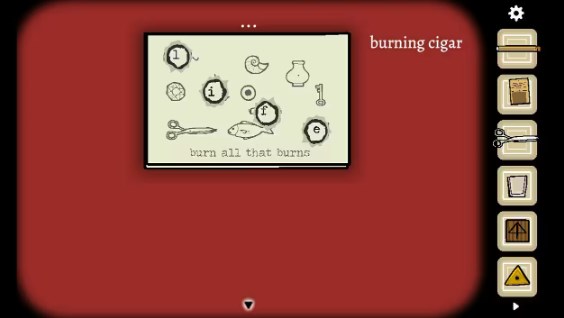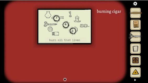 27、在打字机输入「burn」得传单,用「剪刀」从中裁开;叠放后依提示「燃尽一切可燃之物」,以雪茄灼烧纸上可燃元素,显影「life」