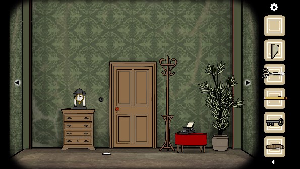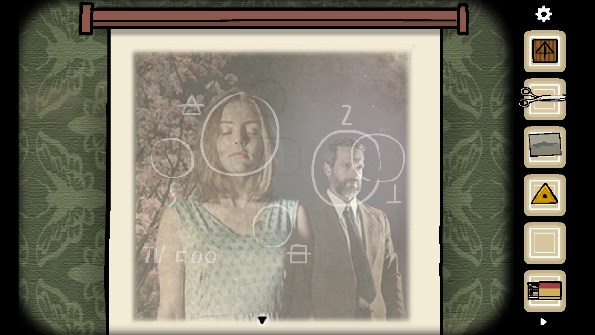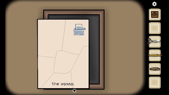 5、将五张碎片拼入相框,得到提示「the woman」(含空格);在打字机输入该词后出现纸张,用铅笔涂抹显影出男人、门、女人及钥匙图案,最终获得第二把「钥匙」