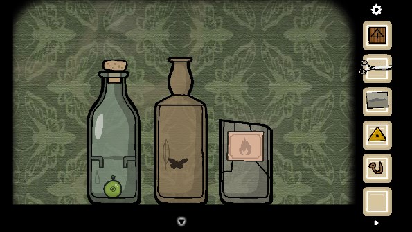 18、点击毛毛虫食叶化蛾;移至沙发,用「剪刀」剖开获取「线」;取走杯子,盛装文件柜瓶中液体倒入第一瓶;将「线」系住瓶塞,挂上「钩子」,最终取得第二枚「绿色眼球」