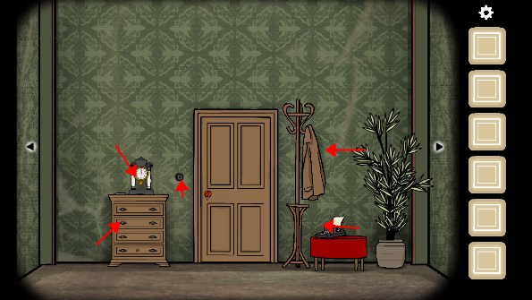 1、拿走衣架上的「大衣」,打开旁边的三层抽屉,取走「剪刀」、「照片碎片」和「铅笔」;打开门旁开关,移步右侧灯罩内获取第二张「照片碎片」