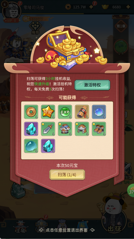 消耗少量元宝即可一键领取2小时挂机收益,同步掉落装备强化石、进阶材料与稀有武将信物,效率翻倍不心疼。