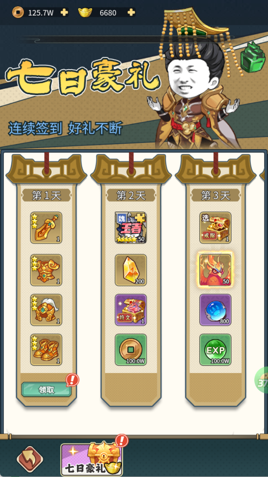 从第1天到第7天,每天解锁不同重量级奖励:极品红装、8星武将碎片、百万经验、稀有坐骑、神将觉醒石……长线资源早规划、早成型。