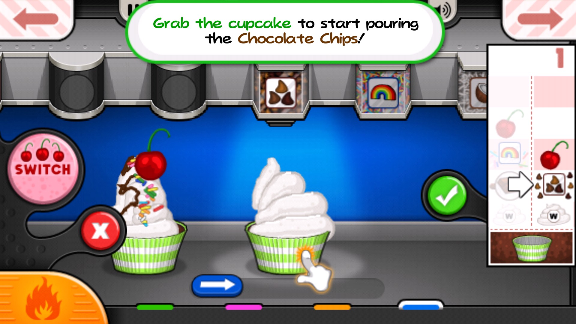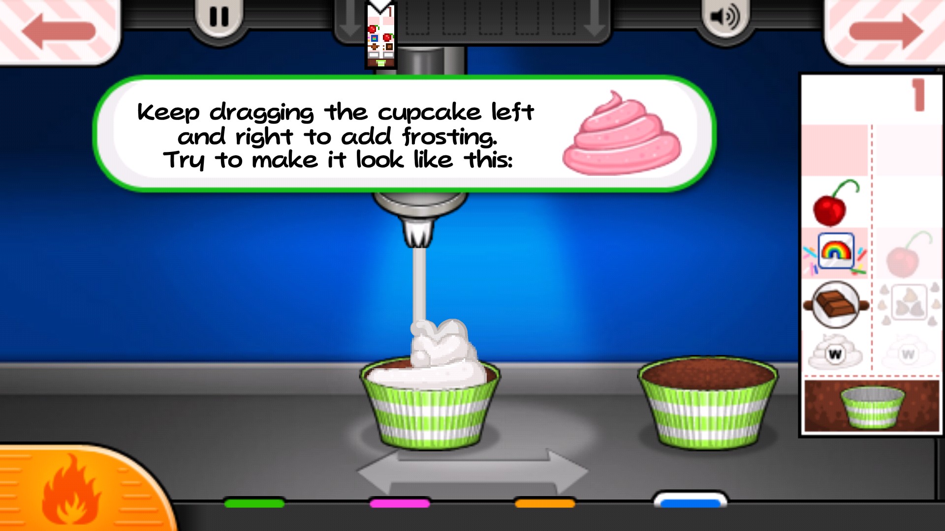 首先选择对应颜色的纸杯,放入蛋糕基底;接着挤出指定颜色的奶油,并尽量模仿图示的造型——还原度越高,评分越高。随后添加顾客指定的配料,务必避免错放,否则将导致差评与低收益。