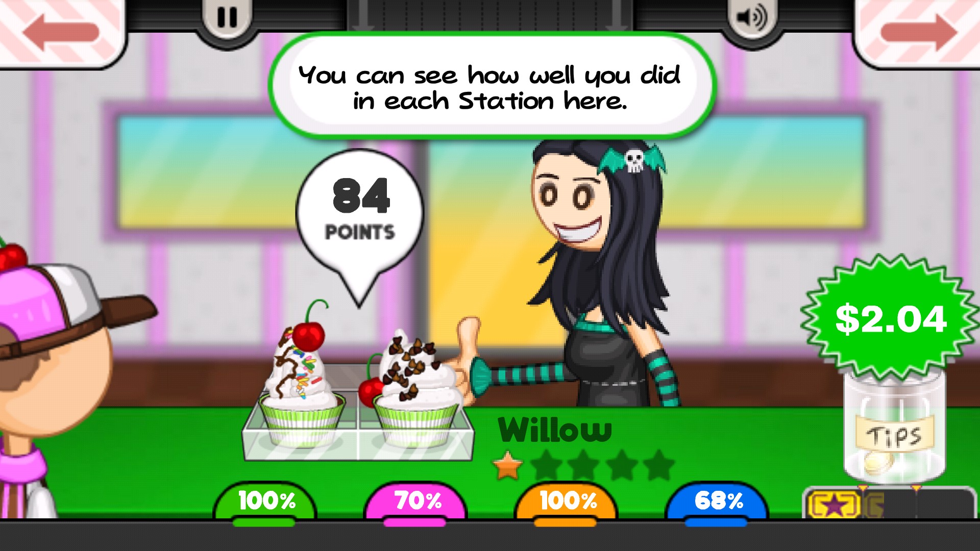 完成制作后,将成品递交给顾客,系统将根据完成度给出评分与报酬。例如,一次精准还原可获得84分及2.04美元奖励,为后续升级打下基础。