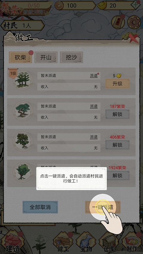 村民安置妥当后,可通过“一键派遣”快速安排工作,系统将自动结算收益。积累资金后,点击左下角【建造】按钮,即可解锁丰富建筑类型——包括景观(如桃树)、设施、场所、桥梁、船只等,自由布局,打造独一无二的江南水镇。