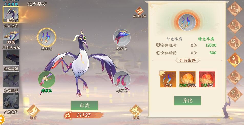 异兽可通过升级与强化提升基础属性,并支持多阶段进化,不同品质对应独特战斗形态,视觉与战力双重升级。进化需通过“异化”四个部位实现——材料可通过异兽隐界副本、异兽传记副本或异兽商店获取。当四个部位均提升至更高品质后,即可在“生品”界面完成突破进化。