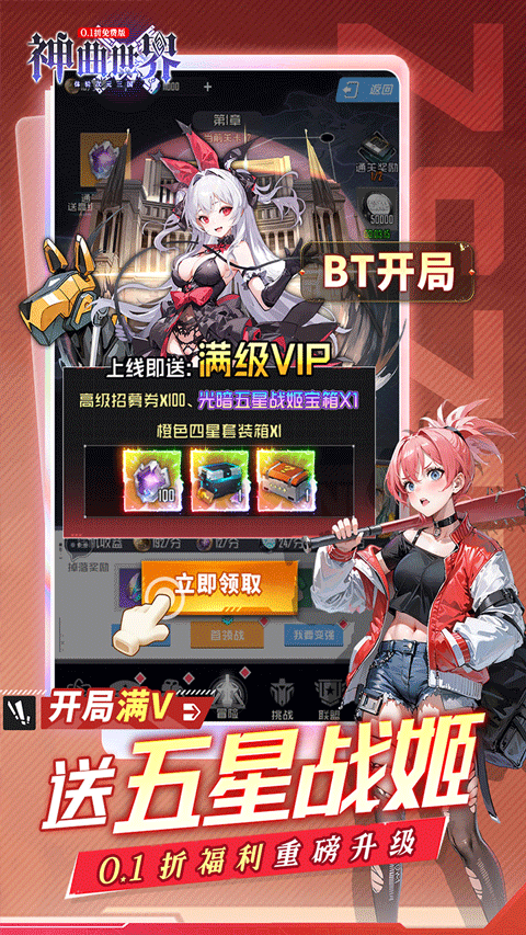 拒绝数值膨胀,真正实现公平竞技!《神曲世界》为所有玩家提供史无前例的开局福利:首充续充统统0.1折,登录即送满V特权、超觉五星武将、四星神装及百连抽。闯关还能持续领取连抽奖励,五星战姬任你抽取;连续登录8天,直接解锁36位五星战姬阵容!更有每日签到赠送2000代金券,资源不断,成长无忧,让你从第一天起就站在高起点,轻松打造梦之队。
