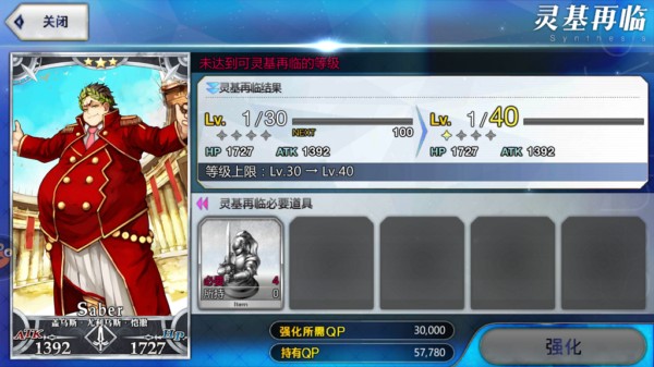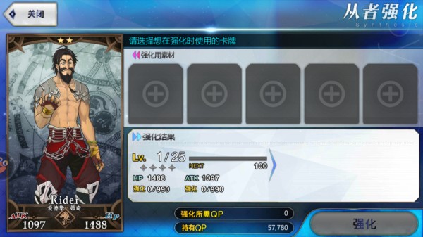 通过消耗经验值卡(俗称“狗粮”)、ATK/HP提升卡(如梅林)及QP,提升从者等级与双围属性。每次最多使用5张素材卡,若包含3星以上稀有卡,系统将弹出确认提示。此外,也可直接消耗其他从者获取经验。