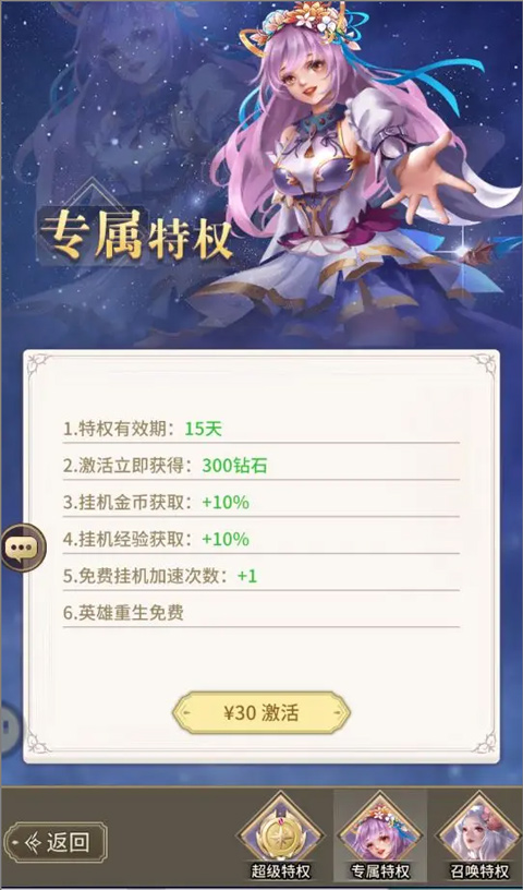 挂机掉落提供稳定且高额的经验收益,印记等级越高,收益越可观。每日可使用四次“加速挂机”功能(首次免费,后三次需少量钻石),立即领取240分钟挂机收益,建议务必用满。开通专属特权还可额外增加经验获取次数,大幅提升成长效率。