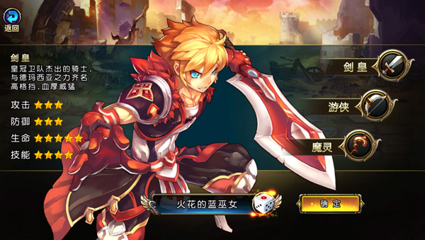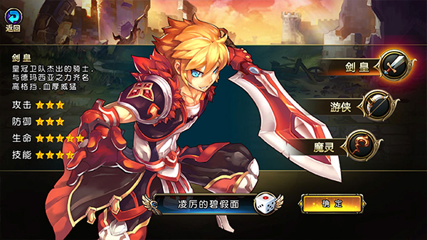 剑皇——皇冠卫队的杰出骑士,以高格挡与厚实生命值著称,是团队中的坚实前排。 攻击:★★★ 防御:★★★ 生命:★★★★★ 技能:★★★★