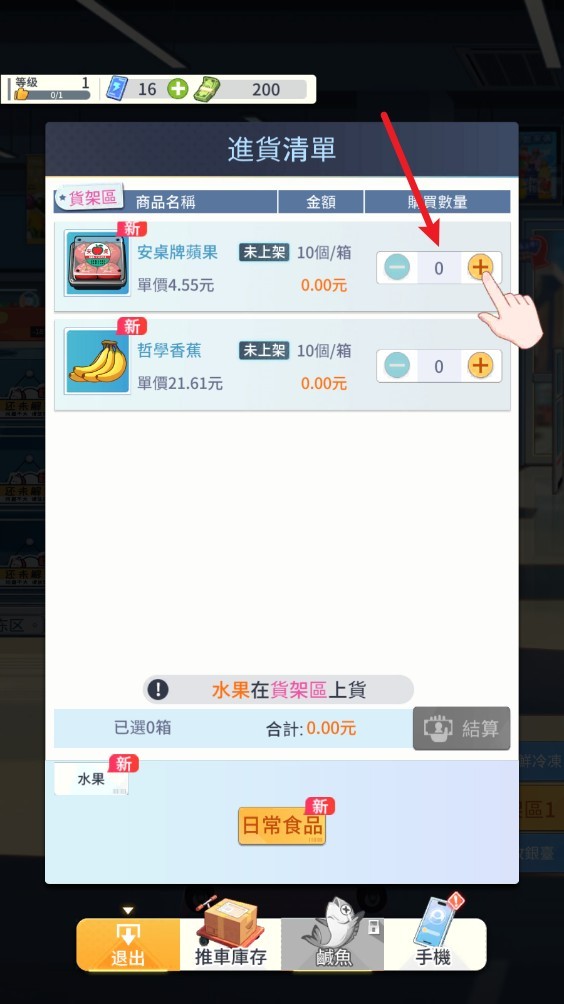游戏以直观的操作引导你快速进入角色。首先点击“进货”按钮,从琳琅满目的商品中挑选热销品,支付后即可安排运输——若想加速到货,还能消耗体力立即送达。