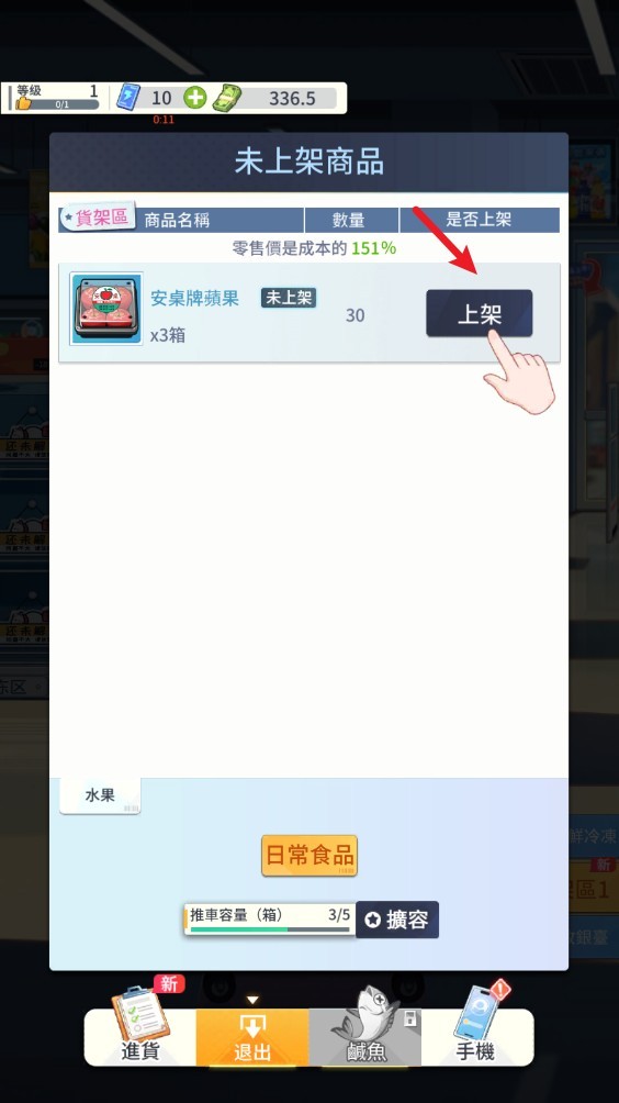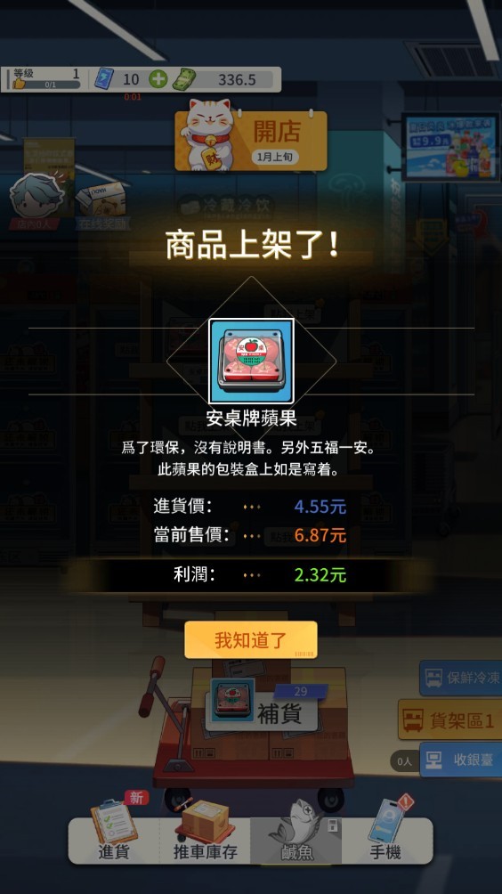 商品到货后,只需将它们拖放到空货架上完成上架,系统会实时显示售价与利润,助你科学决策。随着客流增加,记得及时补货,避免断货影响顾客满意度。