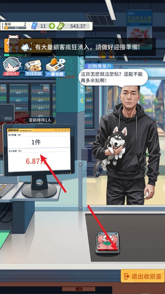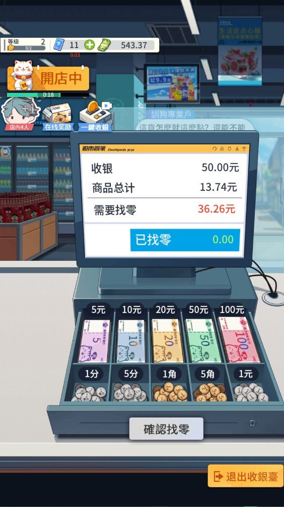 当顾客光临,右下角收银台会提示待结账人数。进入收银界面后,点击商品自动计价,并支持多种支付方式——包括银行卡、扫码支付和现金。使用现金付款时,还需手动找零,考验你的细心与反应力!