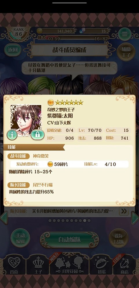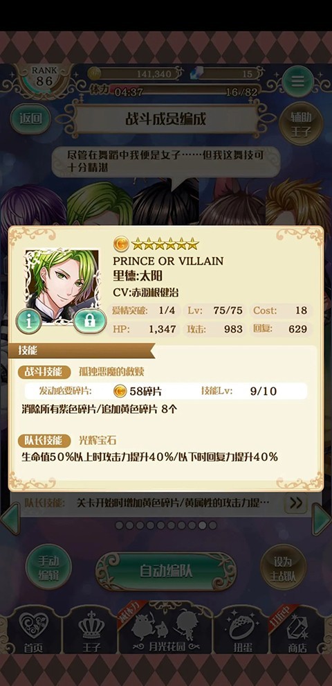 **技能搭配逻辑** 常规配队建议:携带2名具备“转换颜色”技能的王子,用于灵活调整棋盘;1名“提升”类技能(如增加连击、强化消除);1名“消除”类技能(如直线/范围消除)。最后一个位置可根据关卡需求灵活调整——若输出不足可带加血辅助,若时间紧张可选延长时间技能,面对封印机制则优先携带解封印角色。